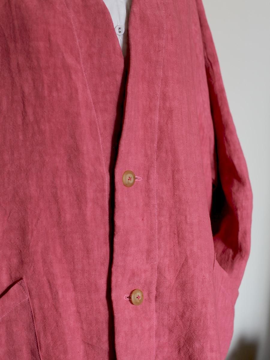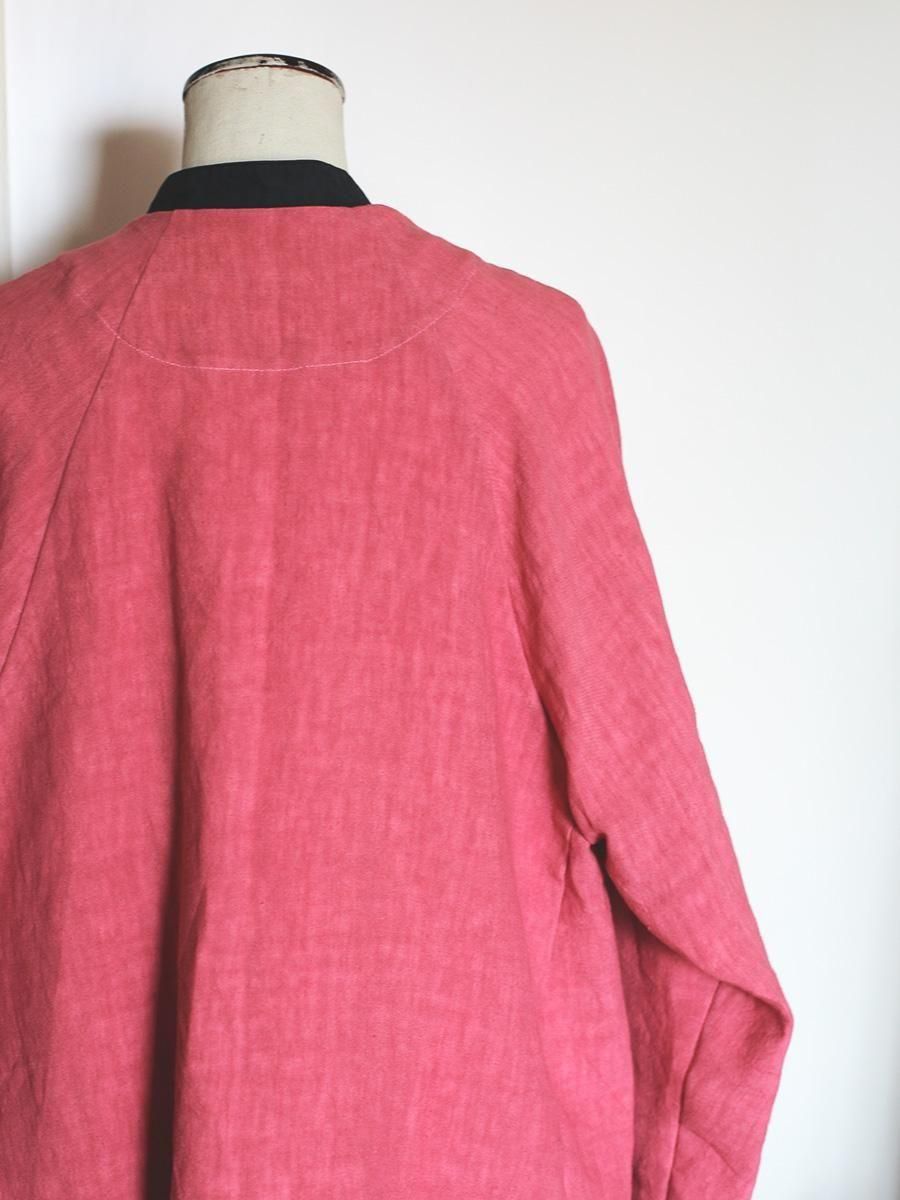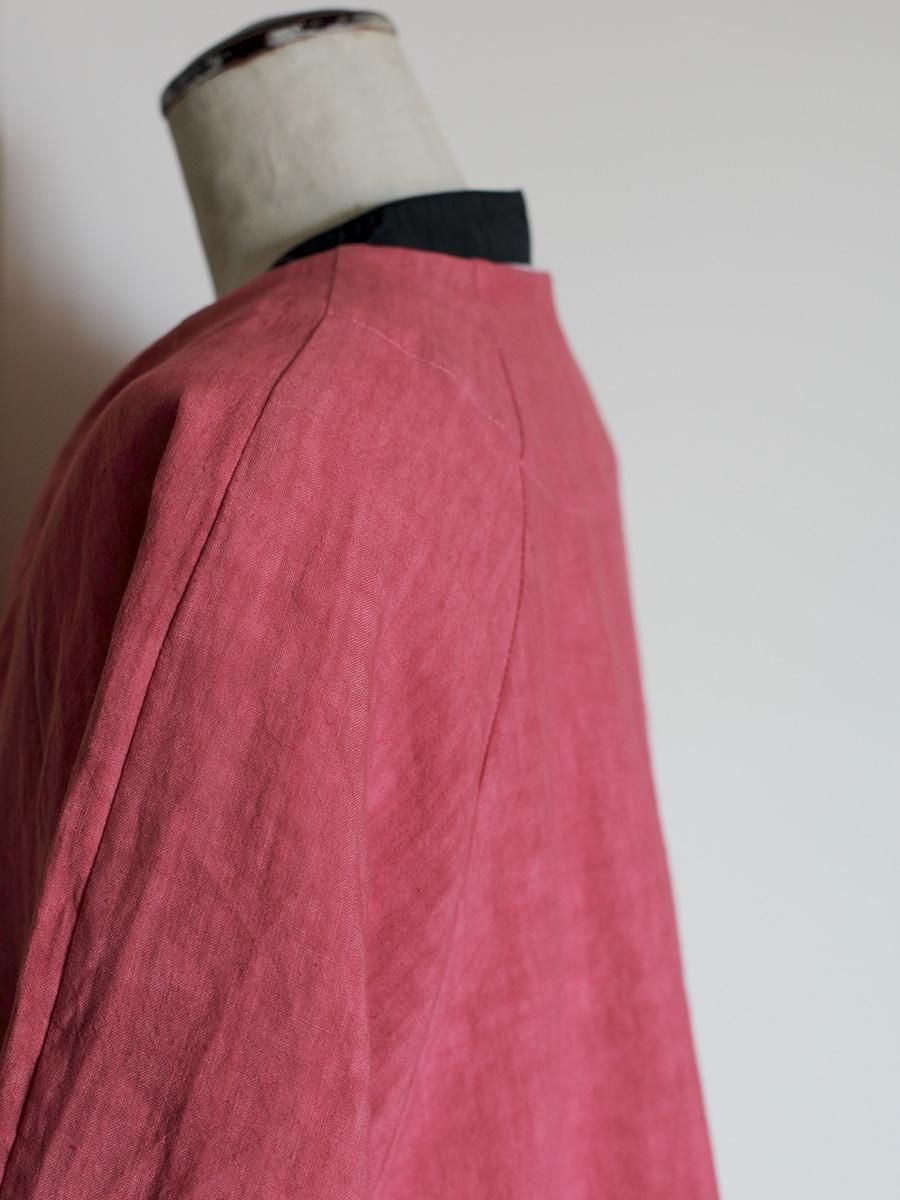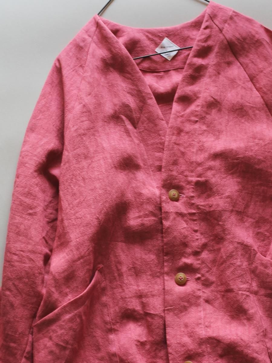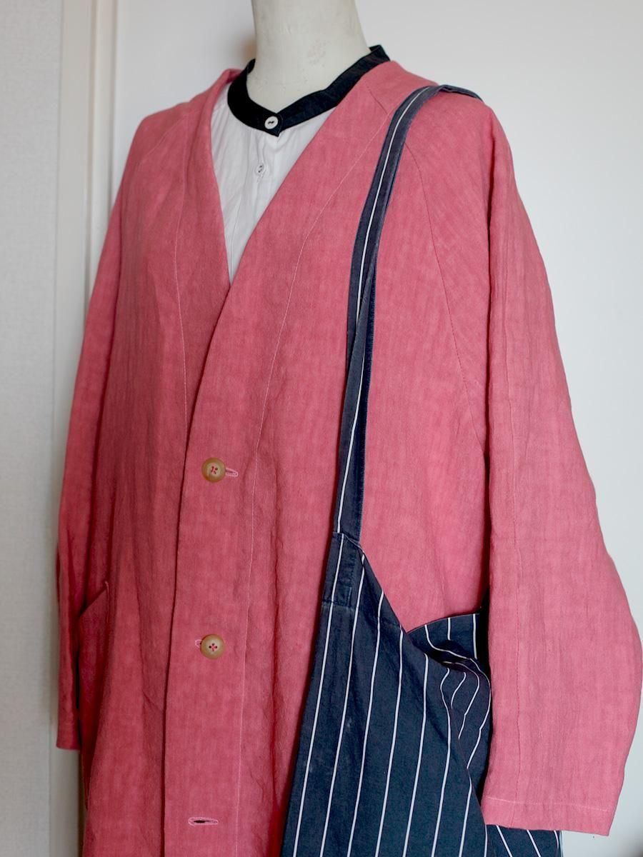 この天日干しリネンの桜ピンクは、春のPOP-UPで大人気でエプロンやバッグ、ポーチなどに加えて2025年秋のくだもの色として画家のコートをお試し制作してみました。