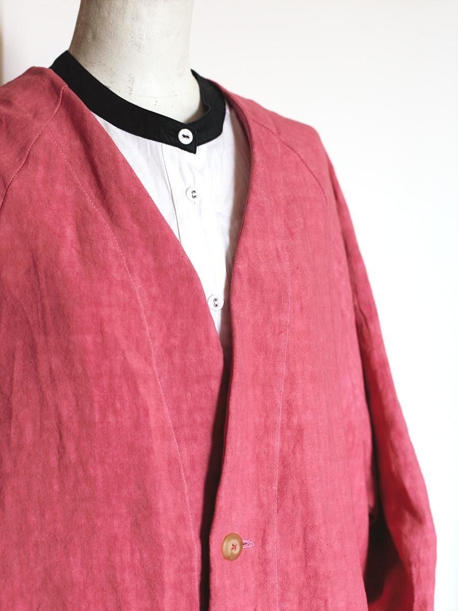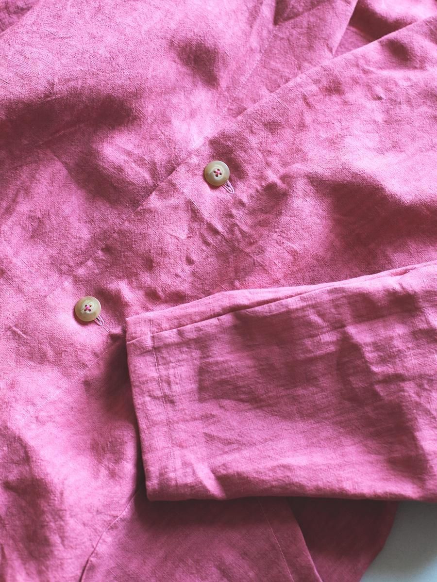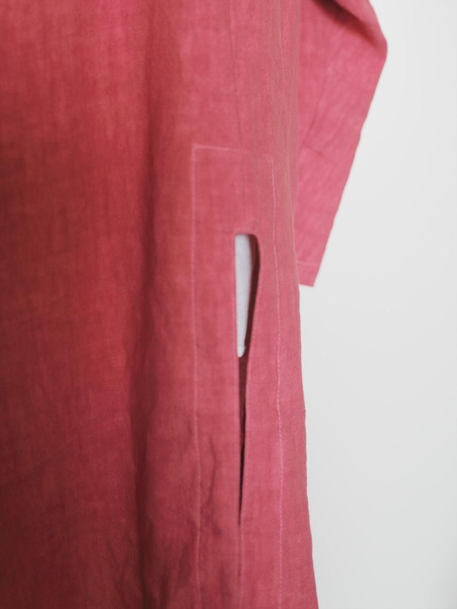 リトアニア製の麻100%の生地を国内で染めて天日干ししたのち、洗いにかけた生地を使用しています。独特のシワ感があり、薄手で洗いざらしのような自然な風合いがあります。製品として仕立てたあとにさらにもう1度弱流水で洗った後にONLINESTOREに出しています。
