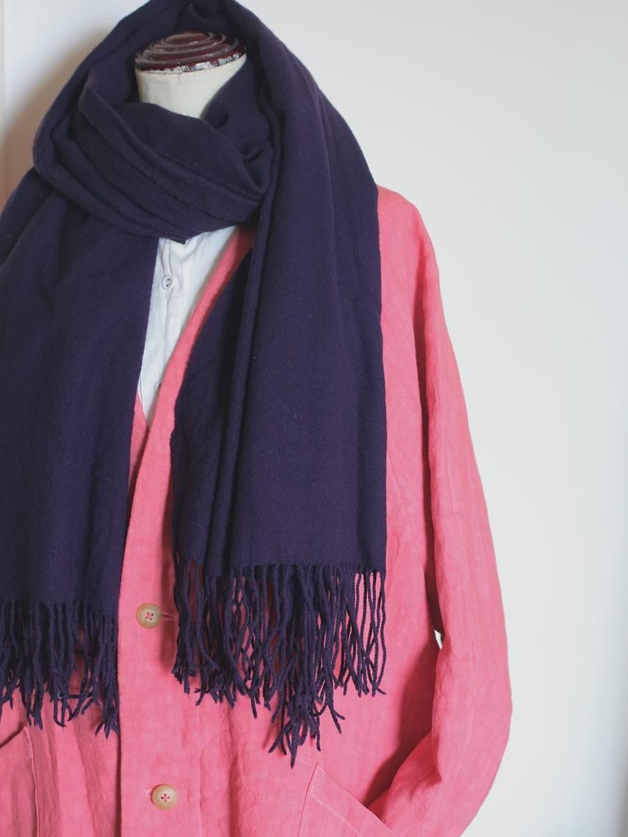 また、襟無しなので中にシャツやタートルネックを着たり、ストールやマフラーをまく時にも首元がごわつきません。