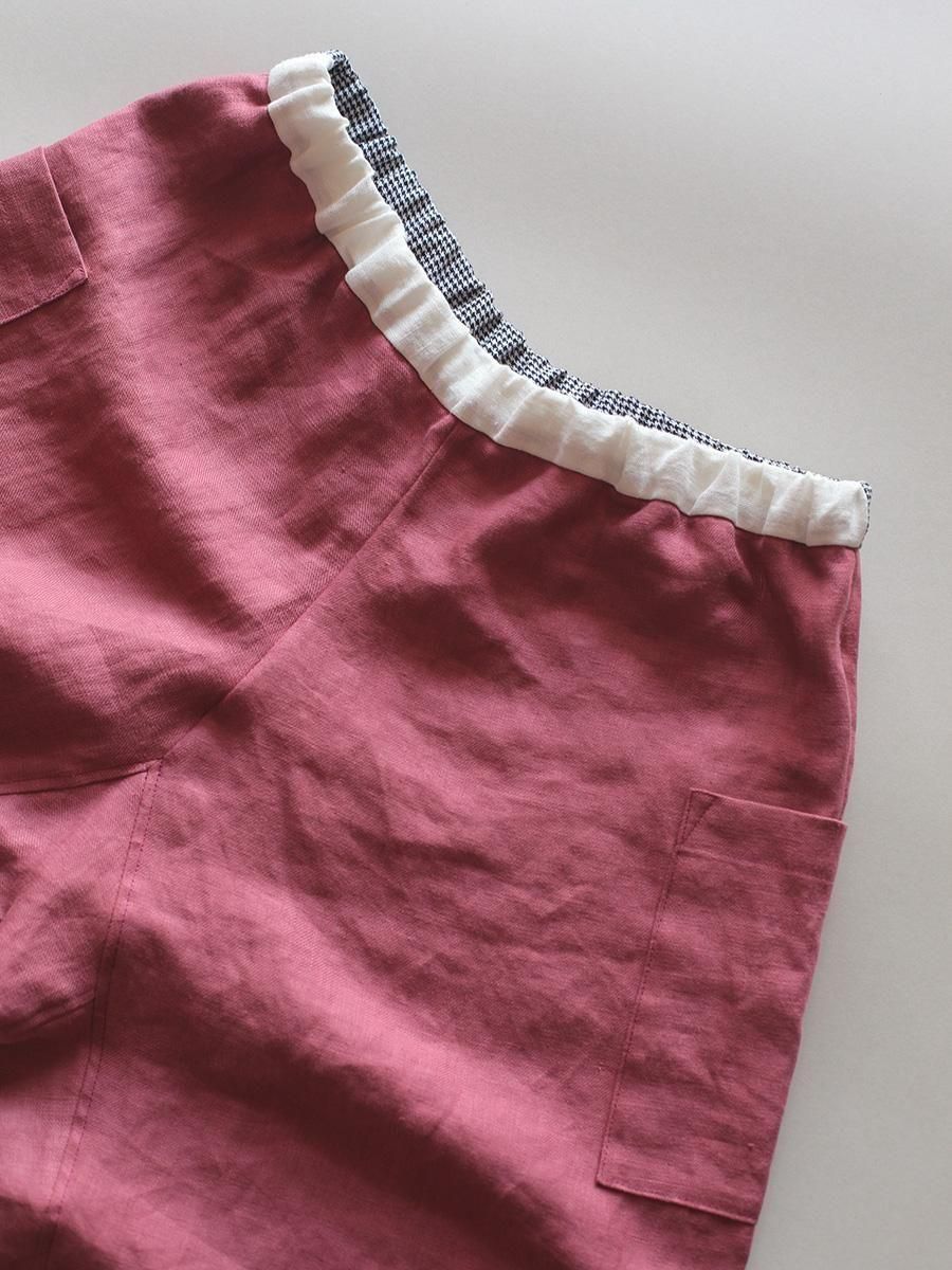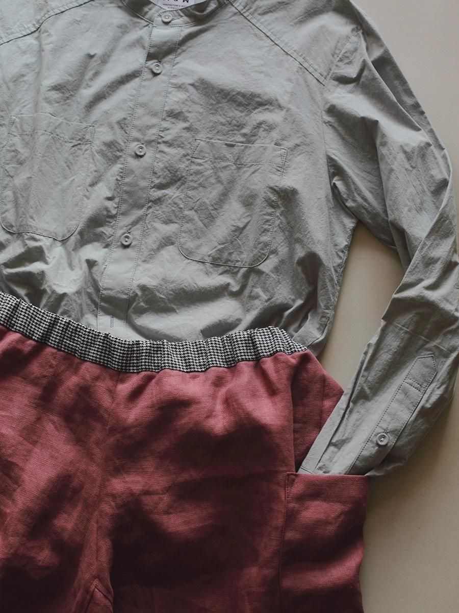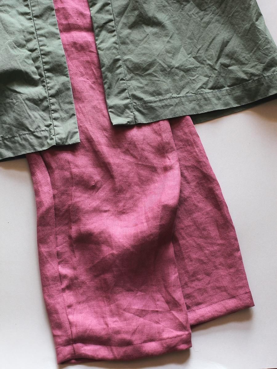 drop aroundが選ぶ生地は、ワークウェアに向いている丈夫で長持ちするリネンやコットン中心で、基本は透けにくく肉厚なものが多いのですが、このリネンツイルはやや光沢感があってなめらか。定番生地よりも、しなやかで柔らかい織りのリネンです。